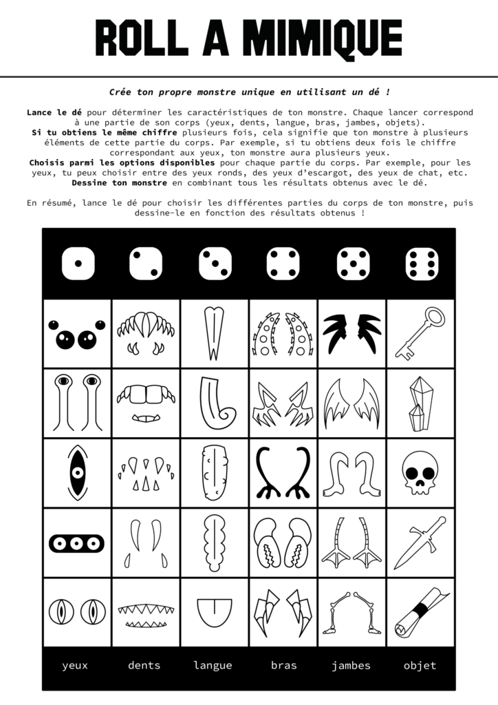 Pour le cas précis du modèle à télécharger gratuitement, voici ce qu’il faudra dessiner en fonction du résultat du lancer de dé :